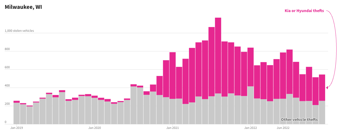 Because, unlike the rise of violent crime (which was a trend in the “statistical” sense), the rise in vehicular theft—which disproportionately impacted Kias and Hyundais—could be directly attributed to a trend in the “internet” sense. An internet trend which first emerged in Milwaukee around the summer of 2021, beginning with viral videos depicting boys joyriding down city streets and sidewalks, before gaining national notoriety in 2022 when videos demonstrating an exploit to steal Kias and Hyundais went viral on TikTok.